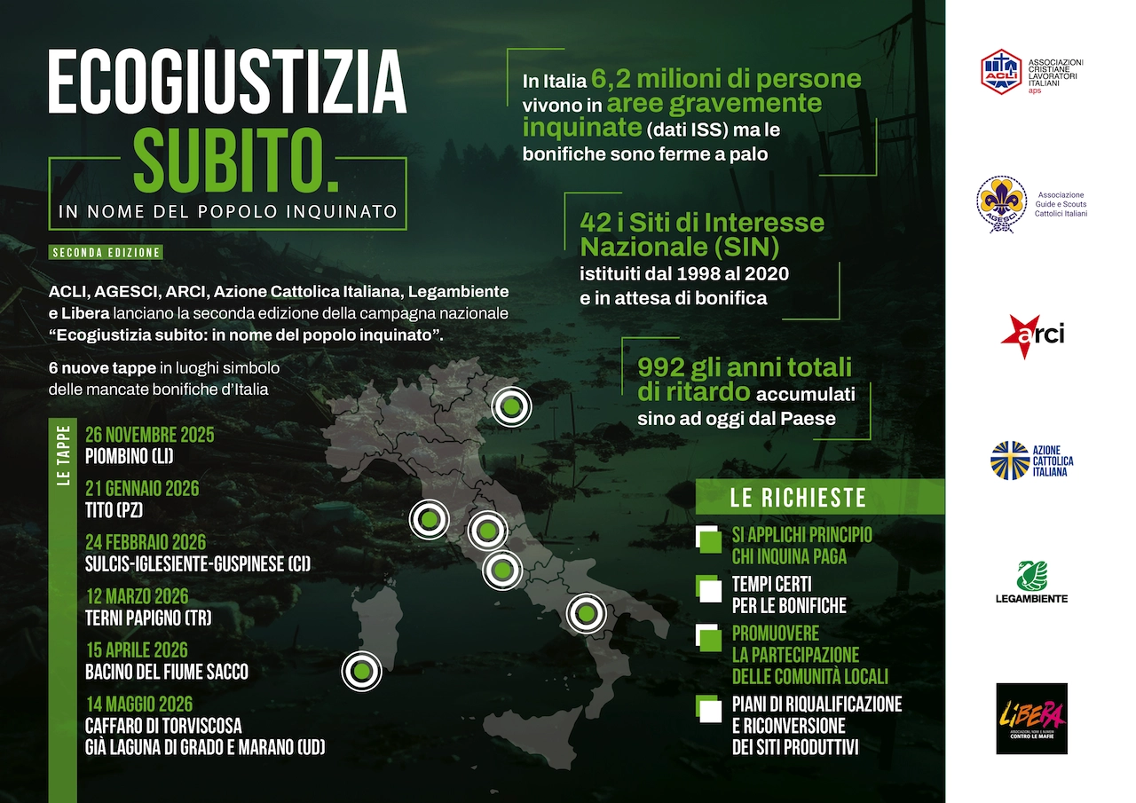 Lo denuncia Legambiente facendo riferimento ai Sin istituiti tra il 1998 e il 2020. Flash mob a Roma insieme ad Acli, Agesci, Arci, Azione cattolica italiana e Libera. «Una vergogna nazionale su cui chiediamo Ecogiustizia In nome del popolo inquinato. La sentenza Cedu sulla Terra dei Fuochi sia un monito per il nostro Paese affinché acceleri anche sulle altre bonifiche»